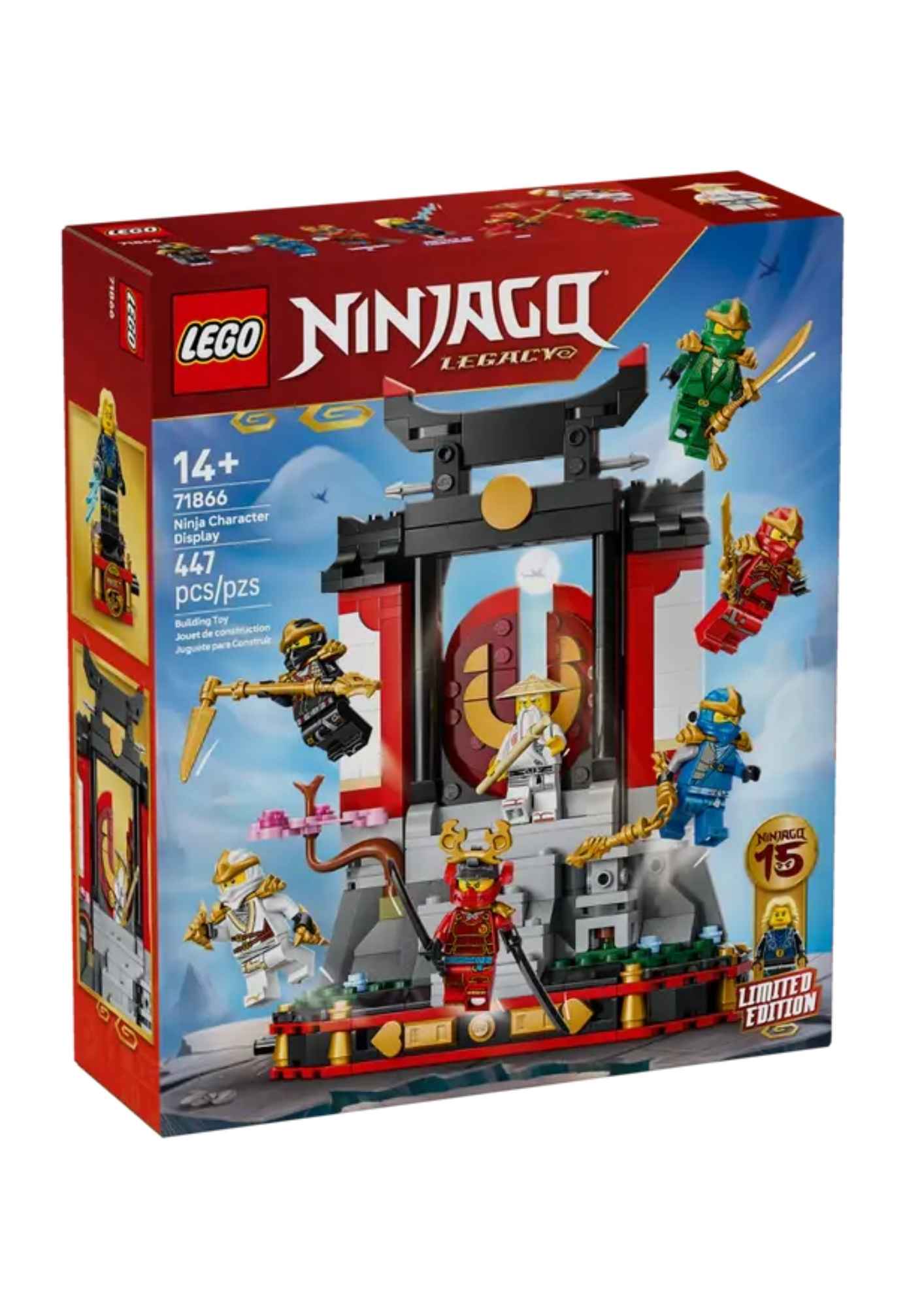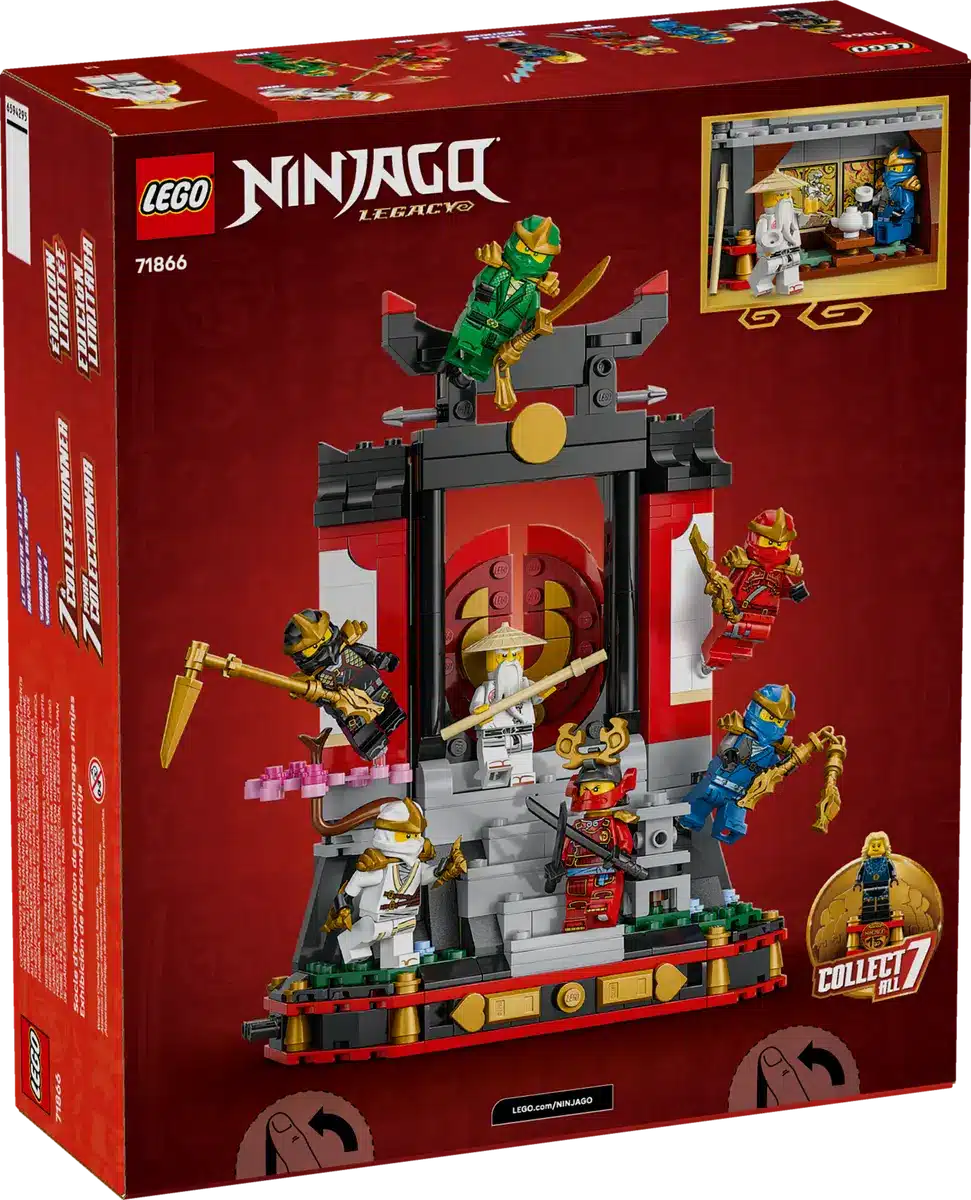 מהדורת חגיגות 15 שנה. הסט מציג מנזר נינג'ה מעוצב בקפידה, הכולל מדרגות, שער נפתח, פנס אבן, עץ פריחת דובדבן מרהיב וחדר תה אחורי המקושט במדבקות המציגות רגעים אייקוניים מקרבות מפורסמים בסדרה. הסט כולל שמונה מיני דמויות - קאי, זאין, קול, ג'יי, לויד, וו וסמוראי X - כל אחת מצוידת בנשק ייחודי וכן מיני דמות לאספנים של אדון יסודות הברק על מעמד ייעודי המתחבר למנזר. סט לגו נינג'גו 71866 כולל 447 חלקים.
